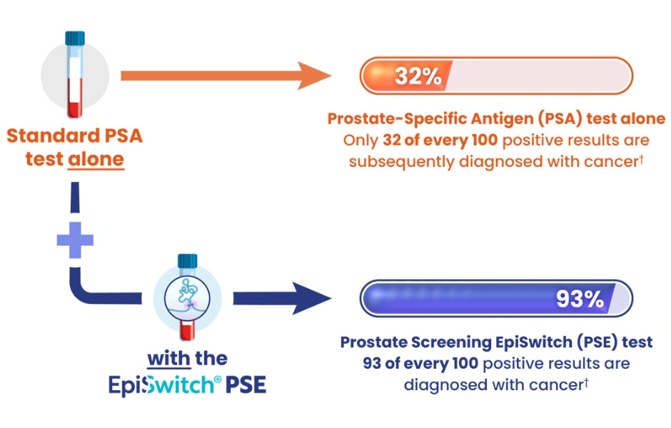 The EpiSwitch® PSE is an advanced blood test with a remarkable accuracy of 94% in detecting prostate cancer. Prostate cancer is a serious concern for many men. While some choose to have a repeat PSA Prostate Test (Prostate Specific Antigen PSA Test), the PSA alone has an accuracy of only 55%. In fact, 3 in 4 men with a high PSA do not actually have cancer.